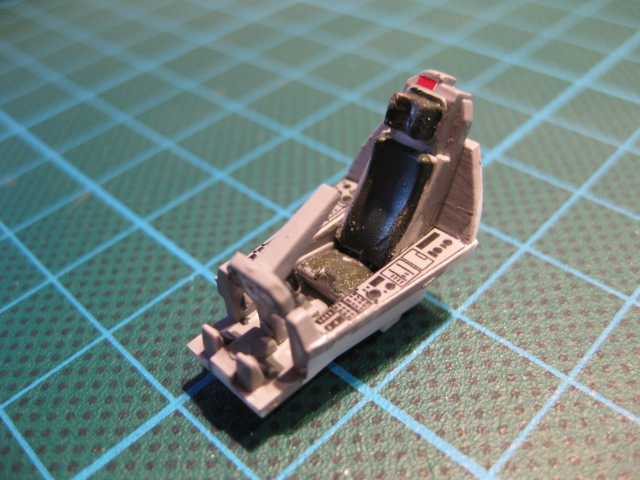 Cockpit med applicerade dekaler för instrumentpanelerna. Trevligt med de två små dekalerna ovanpå stolen, med tanke på att det bara är skala 1/72 så är det en fin detalj.