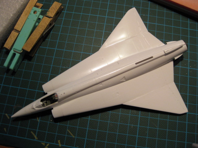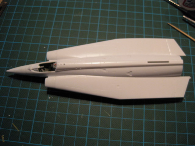 Cockpit på plats och kroppshalvor + luftintag + bakdel + noskon limmade. Även ryggåsen bakom cockpit har limmats fast.