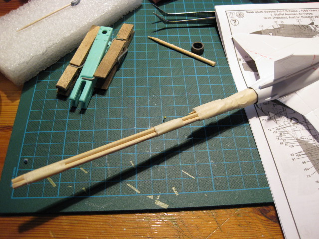 För att underlätta vid sprutmålningen har jag tejpat ihop tre-fyra kebabpinnar och lindat papperstejp i änden och tryckt in den där bak på planet. Pinnen är lätt att hålla i och att manövrera modellen med.