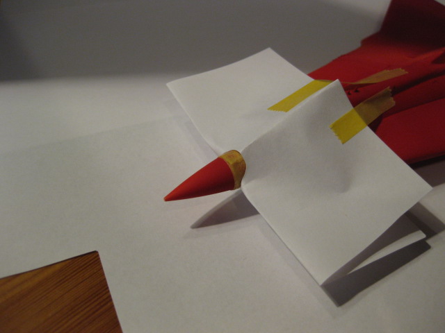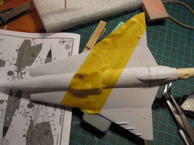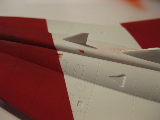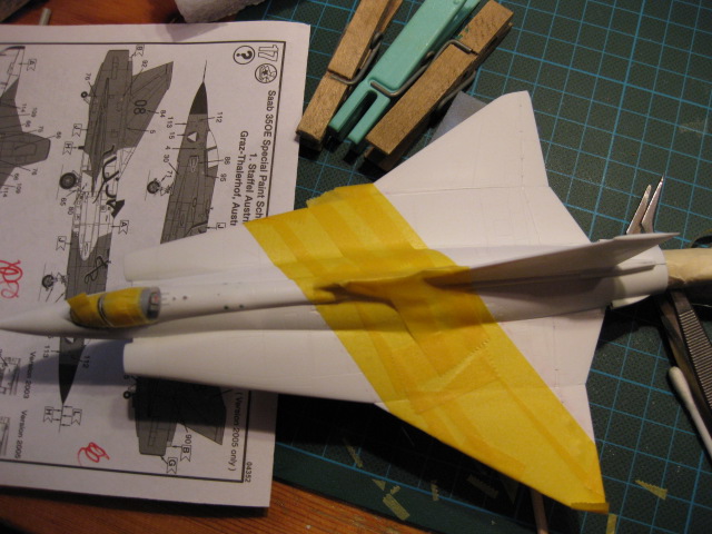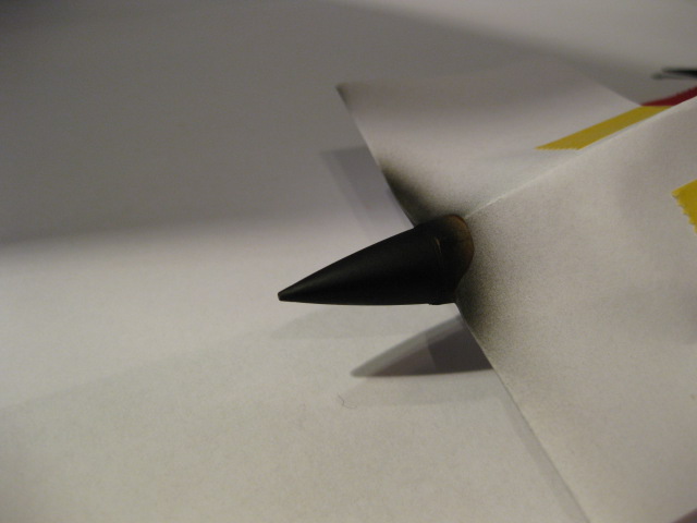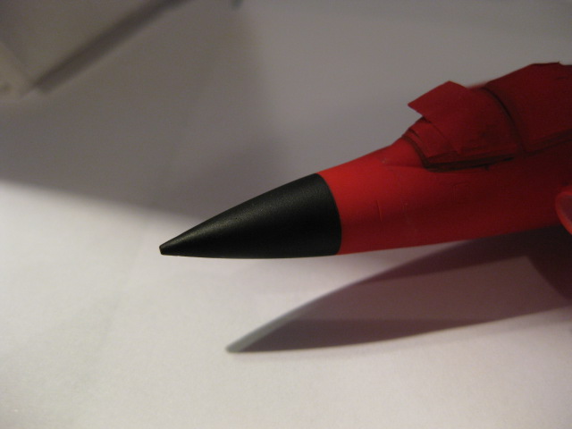 Maskering av noskon. Jag använde 1mm tejp för den yttre kanten och fyllde på insidan med 6mm tejp. Jag tog en bit dubbelvikt papper och klippte en halvmåne som i utvikt läge blev till en perfekt cirkel som passade perfekt över främre partiet. Det spar in på maskeringstejp och är minst lika enkelt att göra.