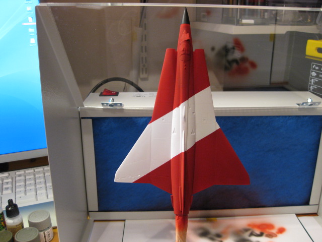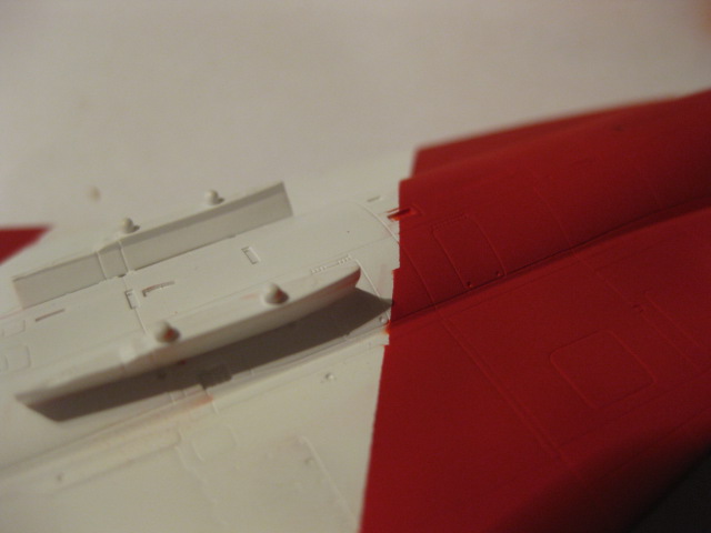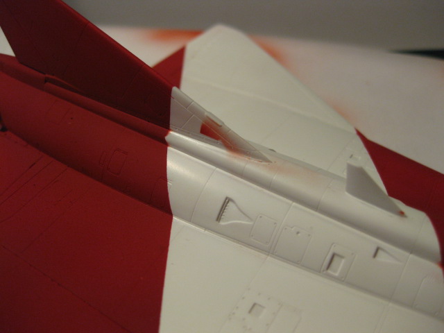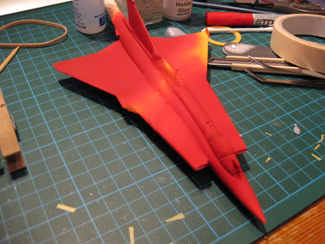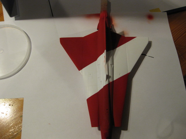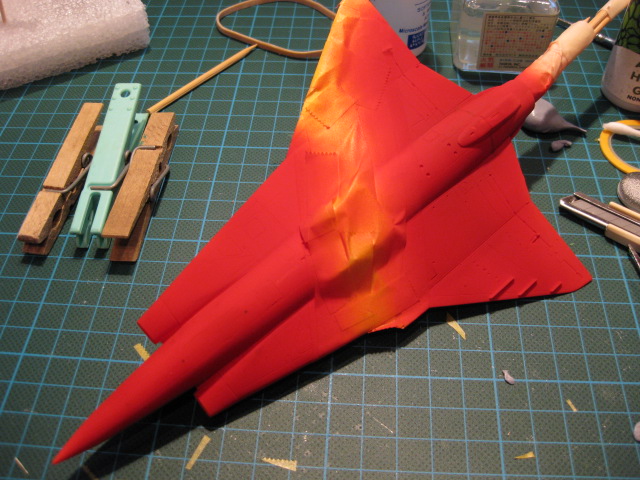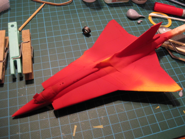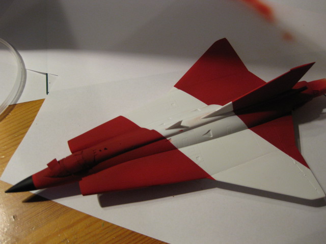 Efter första lagret färg. Planet ser rosa ut men det är belysningen som gör det. Färgen är i själva verket blodröd.