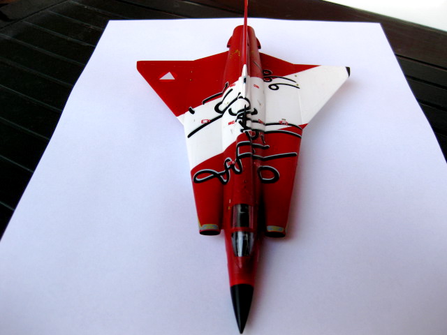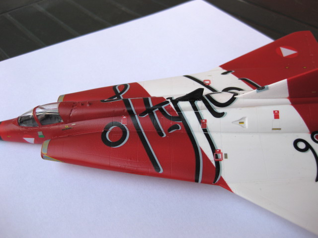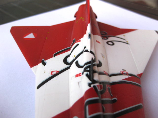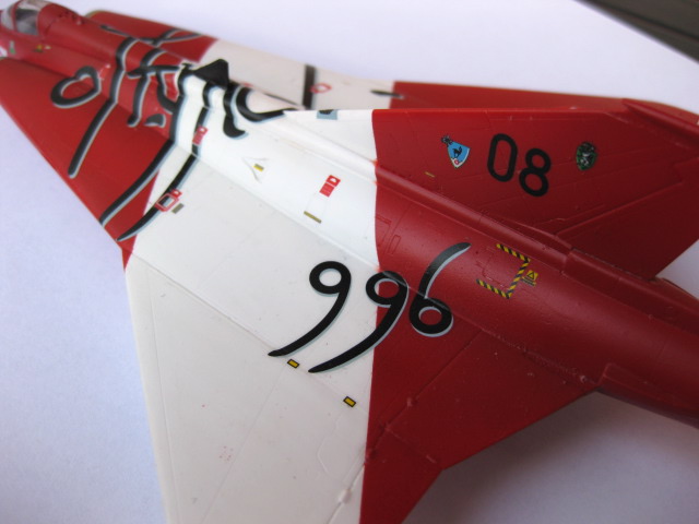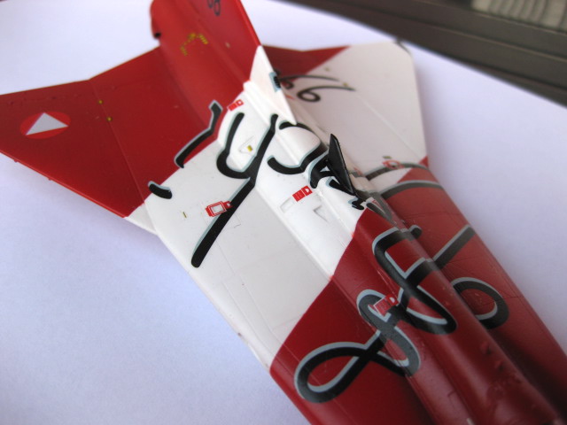 Lördagskvällen spenderades med dekalarket och utmaningen att få den stora dekalen med den snirkliga texten på plats. Det gick förvånansvärt lätt att få på den rätt. Det svåraste var att få den lilla ryggfenan att gå igenom dekalen. Jag måttade och skar ett snitt med hobbykniven där ryggfenan var. Jag lyckades hålla ihop dekalen och få ner den jämnt över ytan, men det lrävdes en del försiktigt sträckande och justerande. Jag funderade ett tag på att skära upp dekalen i mindre block men valde ändå att försöka få på hela dekalen i ett svep och det gick ju bra. Ett par lager med Micro Set mjukade upp dekalen fint över alla konturer. Jag fortsatte sen med alla mindre dekaler, det är en massa små varningsrutor och snådekaler som ska på plats.