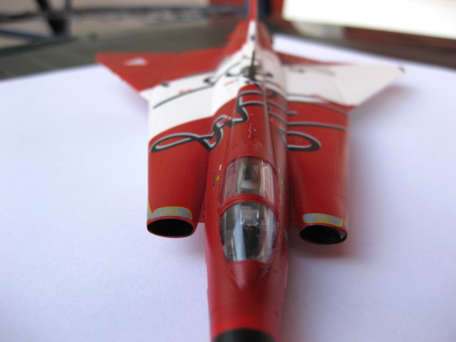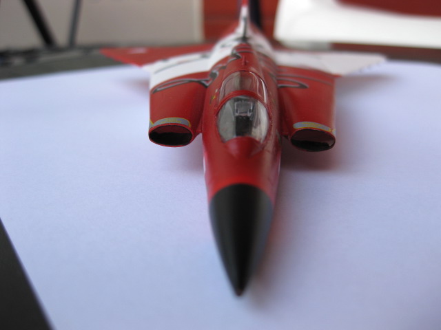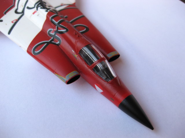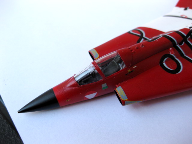 Avslutningsvis limmar jag fast en antenn på undersidan som målas svart och huven avmaskeras. Det är alltid nervöst att plocka bort maskeringstejpen runt huven, man hoppas att all färg har hamnat där den ska. Det såg bra ut, lite färg fick skrapas bort med en tandpetare, en klar fördel med vattenbaserade färger är att det går lätt att få bort överflödig färg utan att behöva slipa ner ytan. Häftmassan plockades bort från insidan av cockpit och huven limmades fast med Gator-lim.