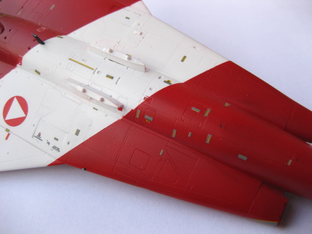 Söndag eftermiddag och dekalandet fortsätter med undersidan som är full av smådekaler. Lite pilligt men med hjälp av en pensel går det lättare att applicera dekalerna, jag "målar" av dekalen från pappret så den fastnar på penseln och kan sen placeras på modellen. Jag rullar en topz över dekalen och avslutar med lite Micro Set för att dekalen ska fästa ordentligt.